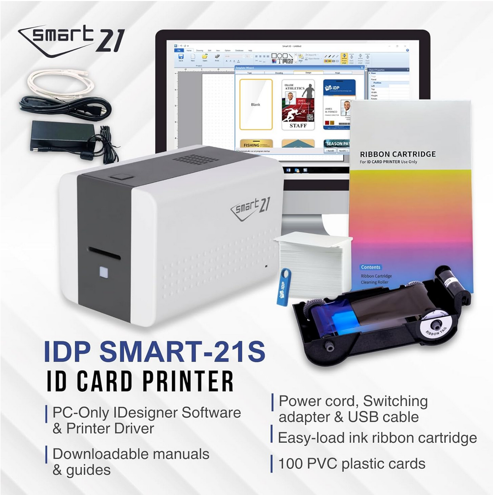 IDP SMART-21SK-EZ ID Card Simplex Printer Kit with Easy-Load Ribbon. PC Only Software, 100 Print YMCKO Color Ribbon, and 100 PVC Plastic Cards - Now with SMARTMark Security