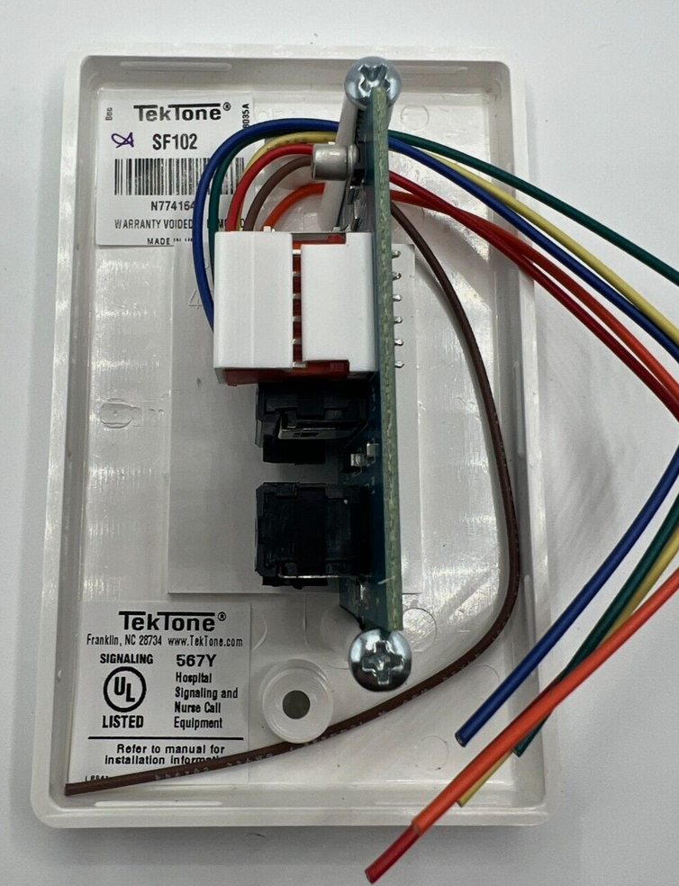 Description : The SF102 Dual Bed Room Station includes two jacks allowing the attachment of two SF301-series Call Cords. A call is registered at the nurse station, corridor light and corridor zone light (if installed) when either cord button is depressed or if either call cord is accidentally removed from the jack on the SF102. The station includes a lighted call-placed switch that lights when a call is placed. The call-placed switch also provides the system cancel function. All of the electronics are mounted on an attractive, flame retardant plastic faceplate.